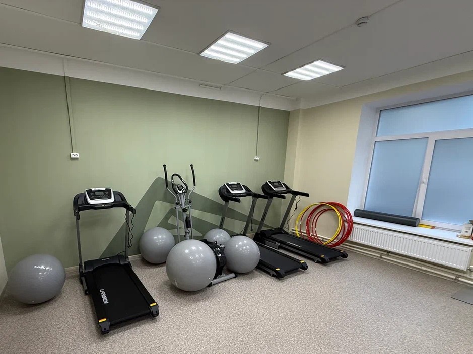 - современный небольшой, но собственный спортивный зал для фитнеса с новым оборудованием: беговыми дорожками, велотренажёрами и другими спортивными снарядами;